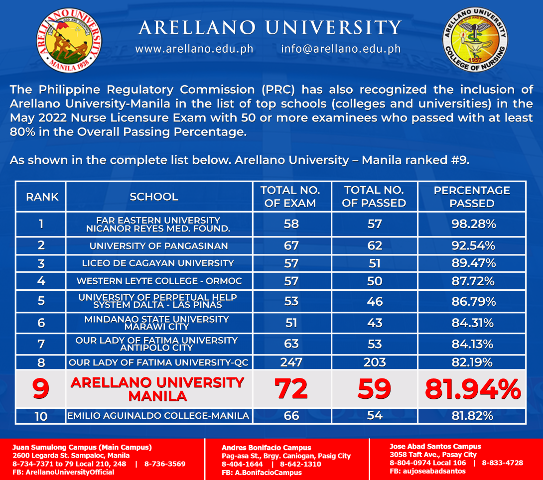 For the second year in a row, the Arellano University College of Nursing (AUSN) was granted recognition by the Professional Regulatory Commission (PRC) as ranking among the top ten nursing schools in the country with 50 or more examinees. Complementing this achievement was landing a top 8 board placer among the top 10 topnotchers last year and a repetition of the same feat this year of landing another among the top 9. Once again this year, in the May 29-30, 2022 Nurse Licensure Examinations (NLE), the roster of outstanding new nurses were led by the following who passed the examinations with distinction: