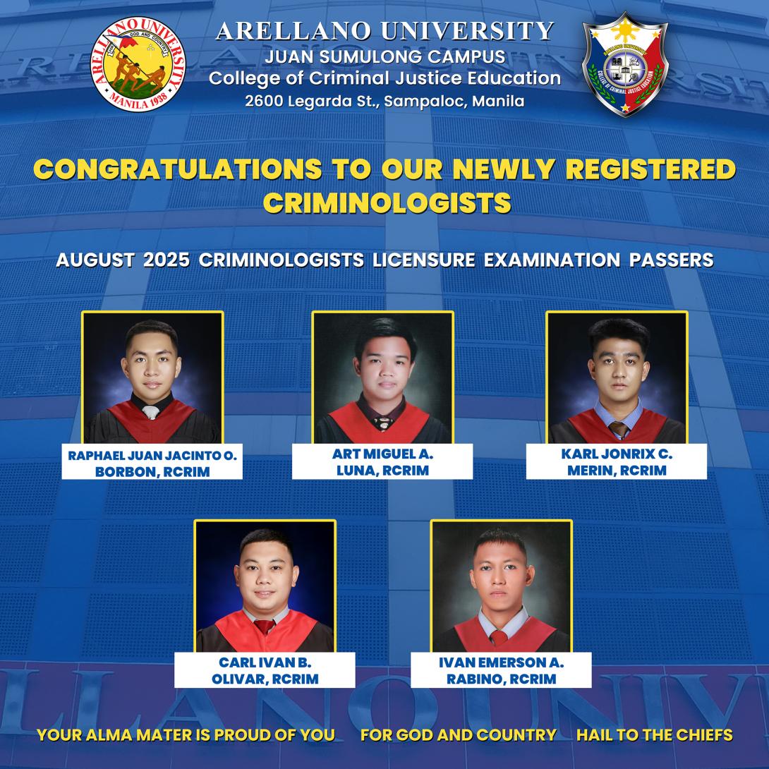 The Arellano University – Juan Sumulong Campus, College of Criminal Justice Education (CCJE), proudly announces the success of its five students who passed the latest Criminologists Licensure Examination (CLE) held last August 2025, which is administered by the Professional Regulation Commission (PRC). These five newly minted Registered Criminologists (RCrim) have earned their titles and are now prepared to join the ranks of law enforcement and security professionals dedicated to serving the nation.