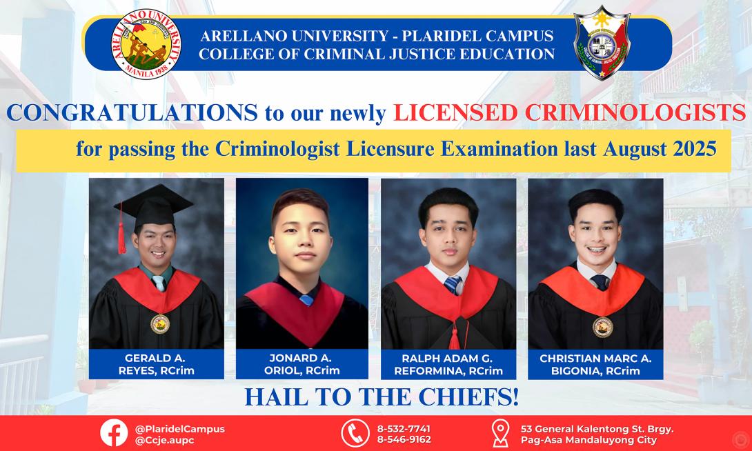 The Arellano University - Plaridel Campus, College of Criminal Justice Education (CCJE) is proud to announce the successful performance of its graduates in the August 2025 Criminologists Licensure Examination (CLE), administered by the Professional Regulation Commission (PRC).
